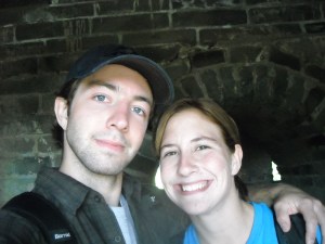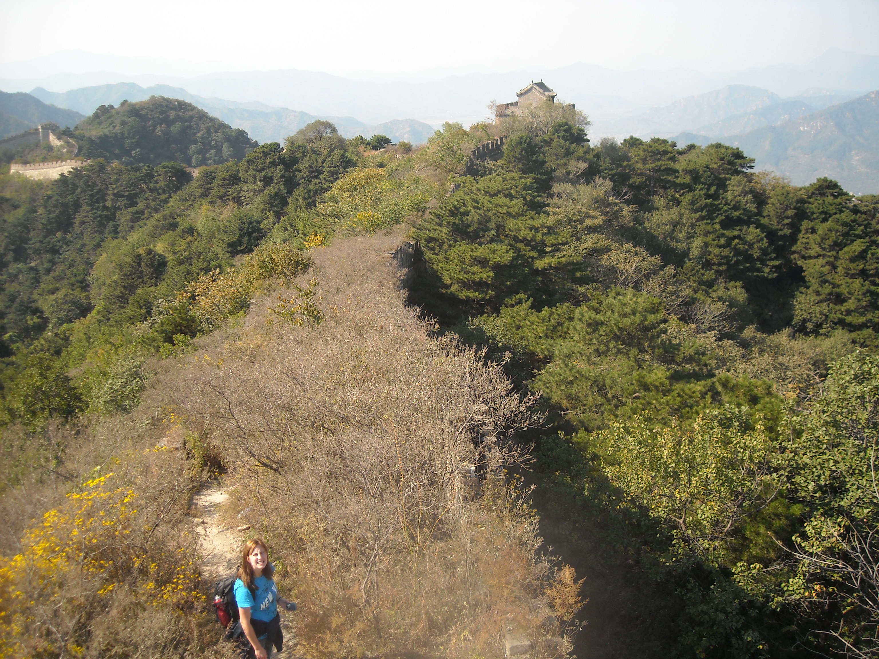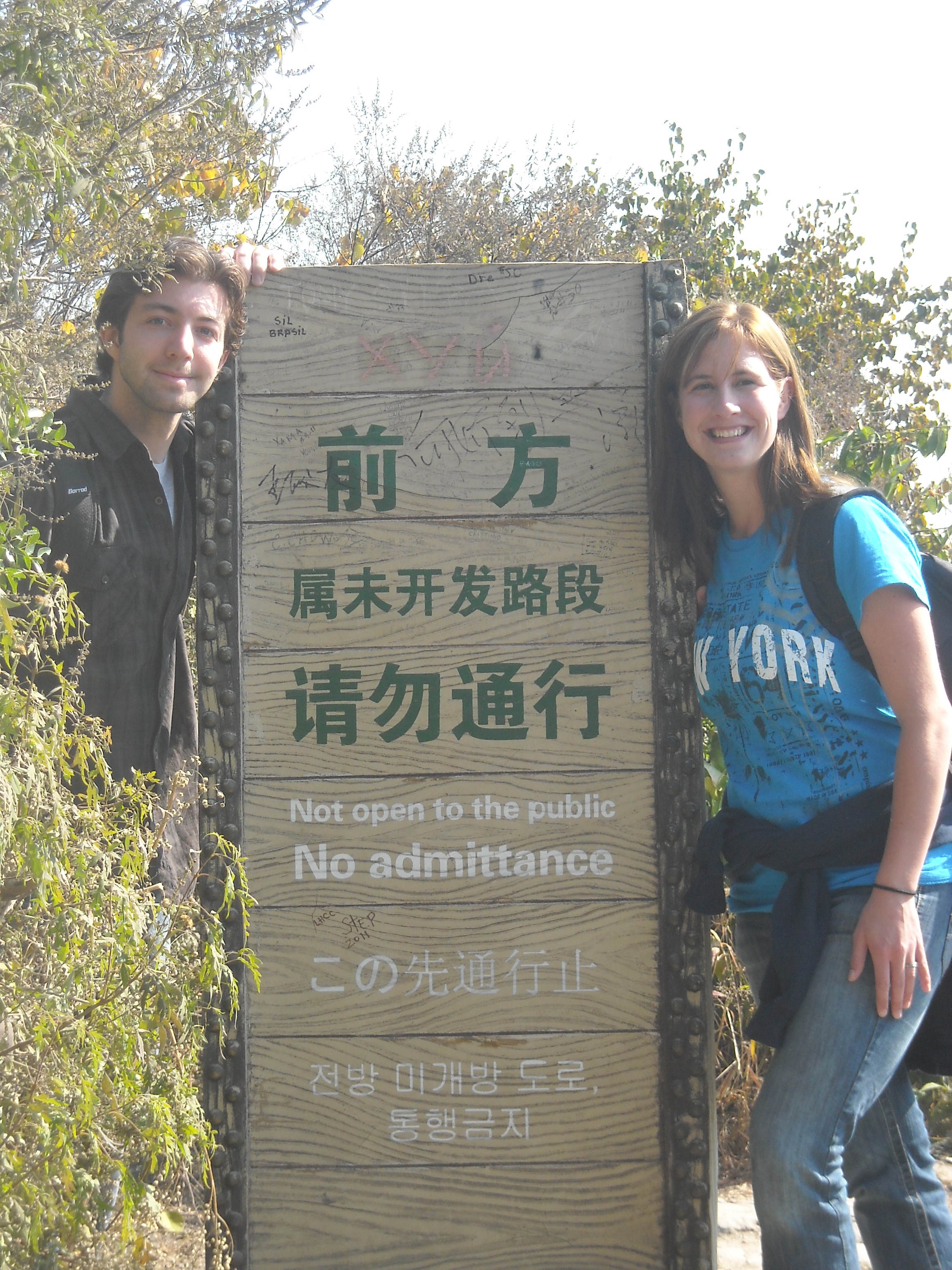 The Great Wall at MutianyuIn this part of the Wall there was foliage and brush growing all around. Made the scenery more breathtaking, and provided a few “artistic” shots.Snapped a shot of us while we were in one of the observation towers along the Wall.Off the beaten path. This section of the Wall was not open to the general public, but we ended up wandering passed the sign anyways. You can see how decrepit and overgrown this section has become.Overgrown and untraveled for hundreds of years, but not forgotten.We kept walking throught the trees and bushes until we came to what remains of an old observation tower.