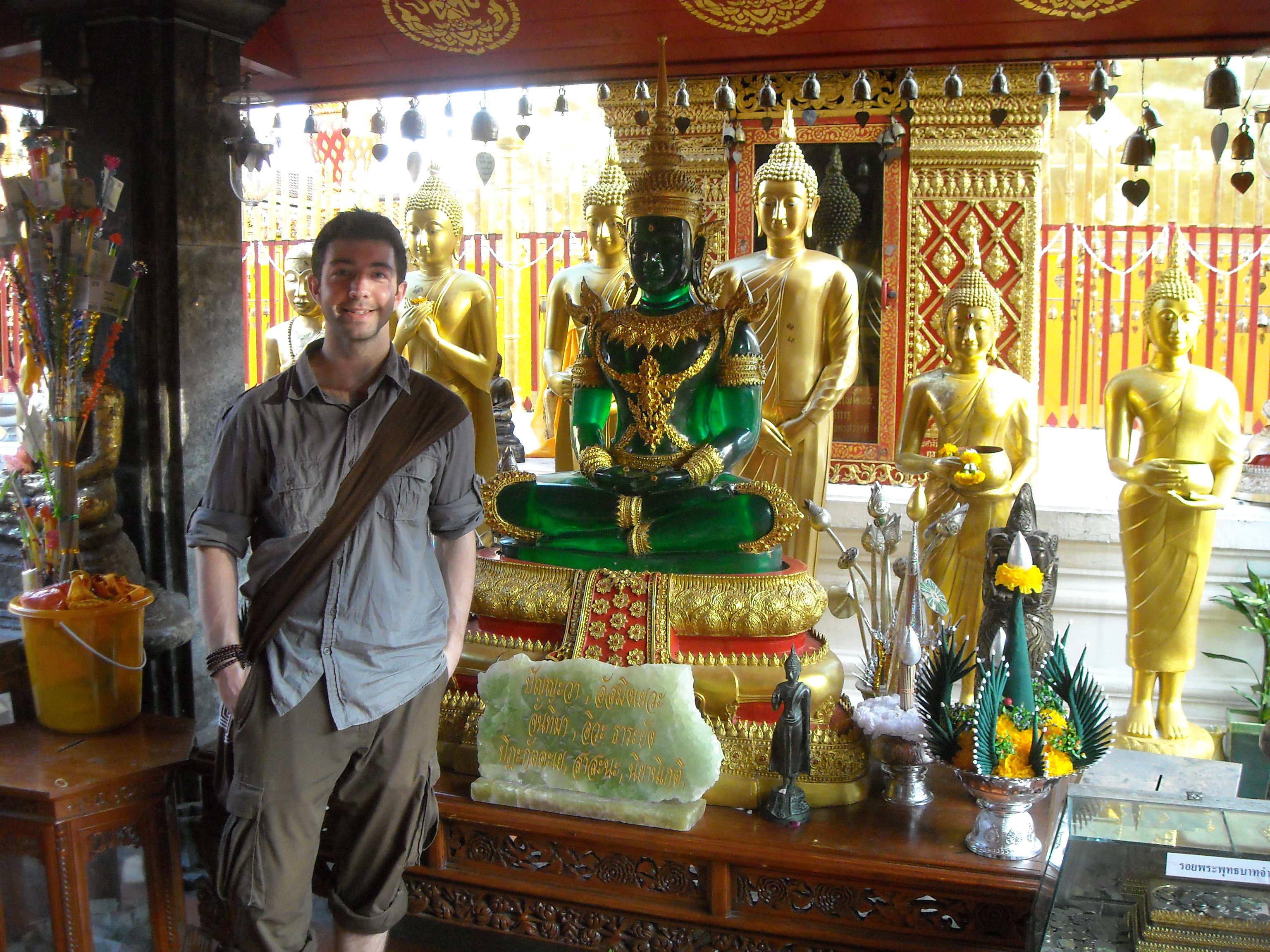 Later that same night Dean, David, Greg ( a young wiry English kid with a mop top), and I went out to the Chiang Mai Night Bazaar. Nik naks, trinkets, store-bought clothes, hand-made clothes, paintings, sculptures, jewelry, magnets, and a hundred different types of food lined the streets and were packed into a few buildings. We waded through it all for about an hour, each of us bargaining for different things we wanted. I bought a bag that I knew I’d never use beyond this vacation. It was a simple brown bag with one strap and a white threaded design on the side. It hung low on my hip once it was around my shoulder, and if I were in any other geographical location I would have felt immediately foolish. But I was proud because I had haggled the guy down quite a bit. Negotiating in China has apparently made me much better. Even the other guys said it was pretty impressive hearing me use different tactics to get the merchant down below half of what he originally said. Thank you, China.