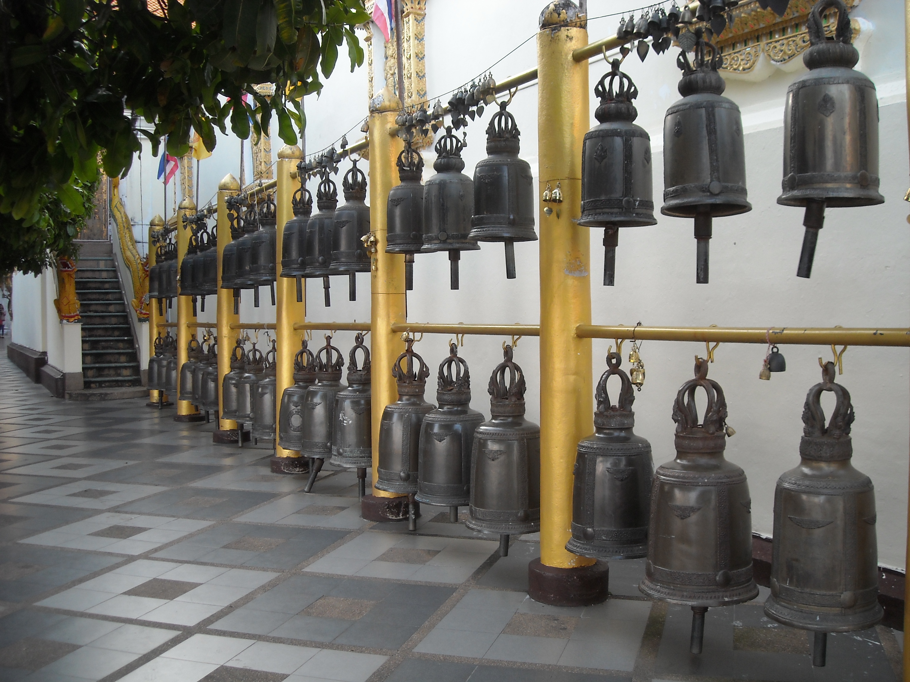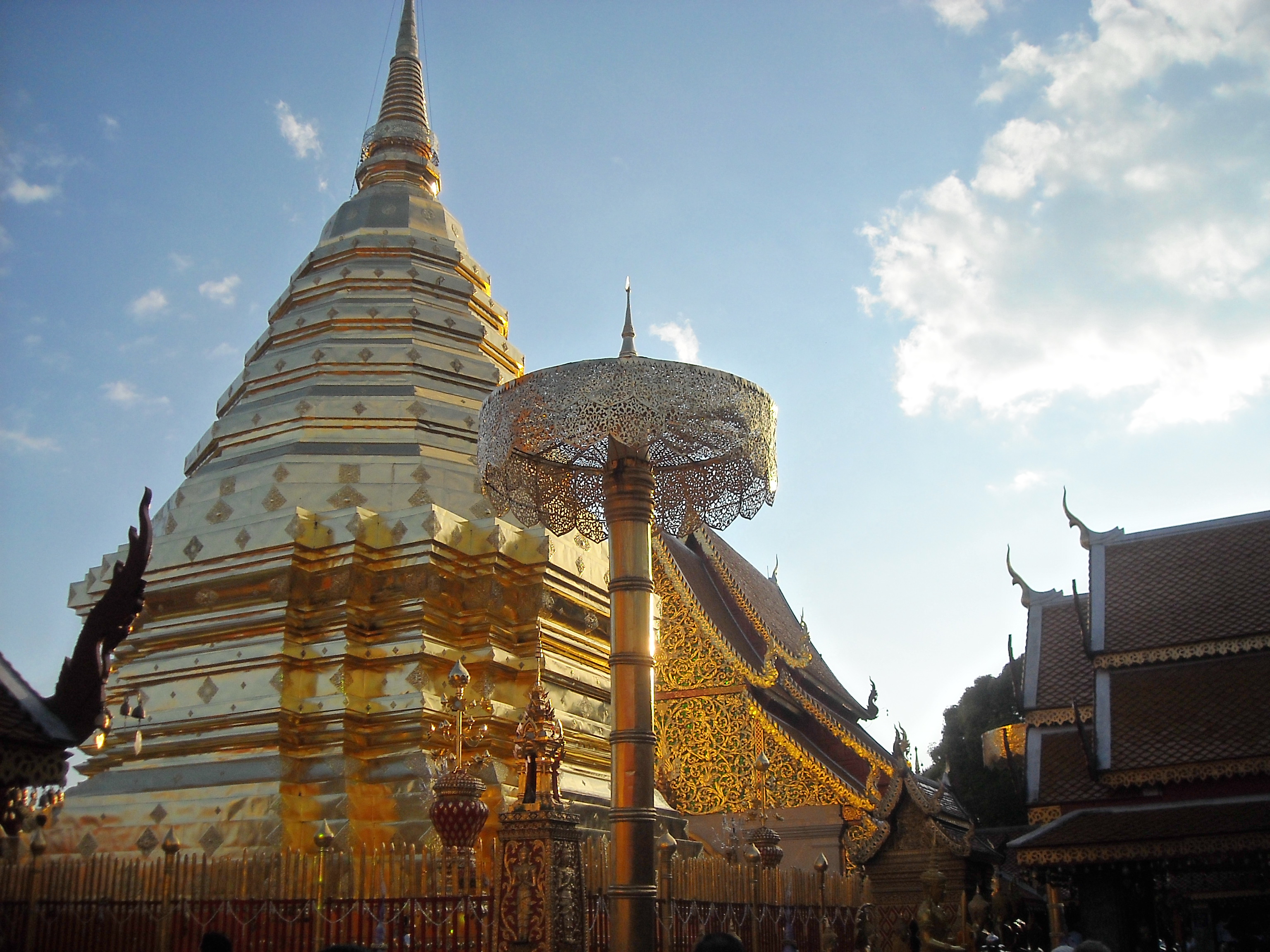 A big attraction in the area of Chiang Mai is Doi Suthep temple. Later that day Dean and I grabbed a taxi and it took us to the launching-off point for the temple, a stretch of road with some kiosks and more parked taxis. Because it was just the two of us, no taxi wanted to take us without having us pay an exorbitant amount. At one point a driver calmly sat us down and drew a diagram in the dirt. He drew the bus, the mountain, and then showed us how each taxi takes a certain amount of people at a set price: 800 baht. Gas is expensive, he said. Dean and I told him what we were quoted—70 baht each—and the man laughed, shook his head, and wrote 800 in the dirt. At that point I erased one of the zeroes and said, “there, now it’s 80, let’s go.” He wasn’t amused. He tried to write it again, but we told him that it didn’t matter how many times he did it, we weren’t paying that much.