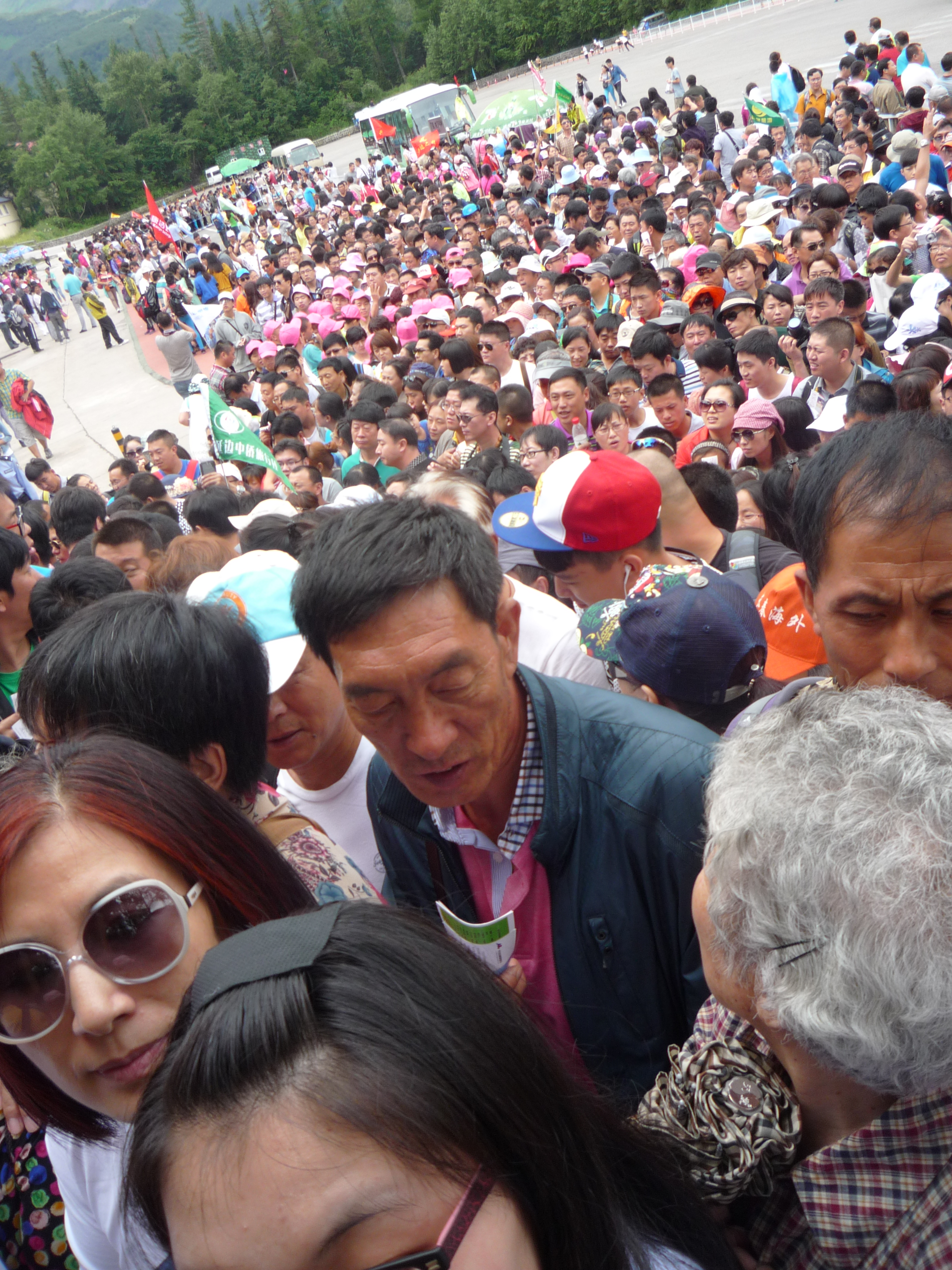 On the third day there, it stopped raining long enough for us to summit the top. We set out early, and then realized it hadn’t been early enough. Ten thousand or more (easily more) crowded around the outside and inside of the check-in building. A few thousand more packed in tight as they herded themselves through corrals that led to little shuttle busses that rocketed up the side of the mountain to another spot where the people had to queue up again…then they boarded tiny white vans that shot up the narrow road to the top of Changbai Shan. Every van sped up and down the roads, always keeping a distance of a car and a half between themselves, much like the worker bugs in a giant ant farm. We waited in lines for hours that day, and then, when we got to the top: Fog.